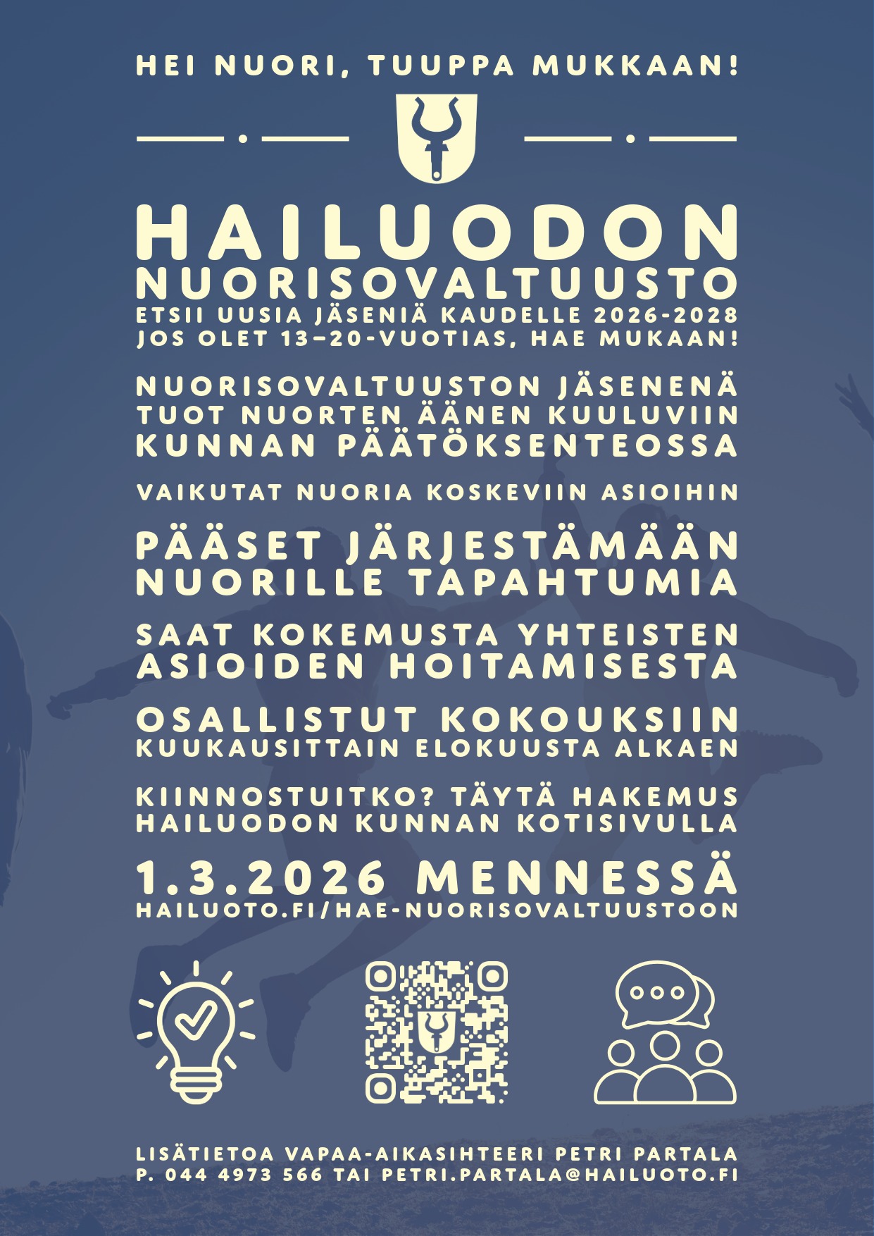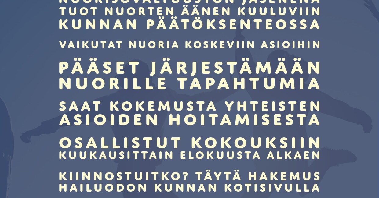 Nuorisovaltuusto etsii uusia jäseniä kaudelle 2026-2028. Jos olet 13-20-vuotias, hae mukaan! Lomake löytyy sivun alaosasta.