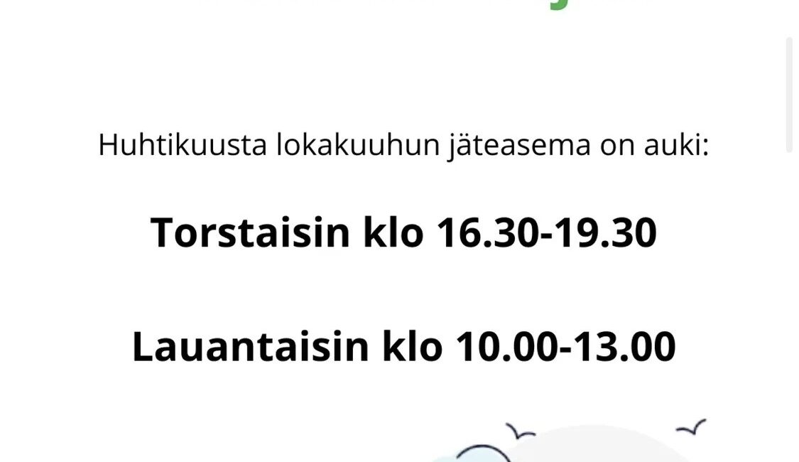 Jäteasema on avoinna läpi vuoden torstaisin klo 16.30–19.30 ja huhtikuusta lokakuuhun myös lauantaisin klo 10.00–13.00.