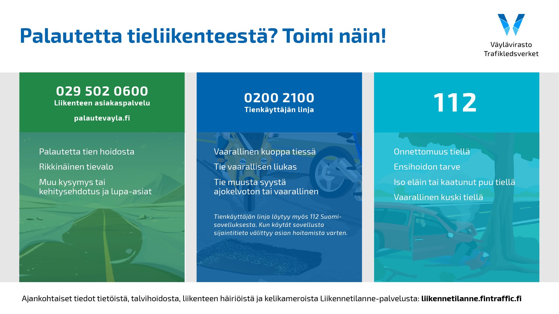 Oletko huomannut tieliikenteessä huomautettavaa? Tässä sinulle ohjeistus mihin puhelinnumeroon tai sähköpostiin ottaa yhteyttä eri asioissa. Palauteväylässä voit tehdä suoraan tarkan ilmoituksen tien kunnosta tai muusta ongelmasta.