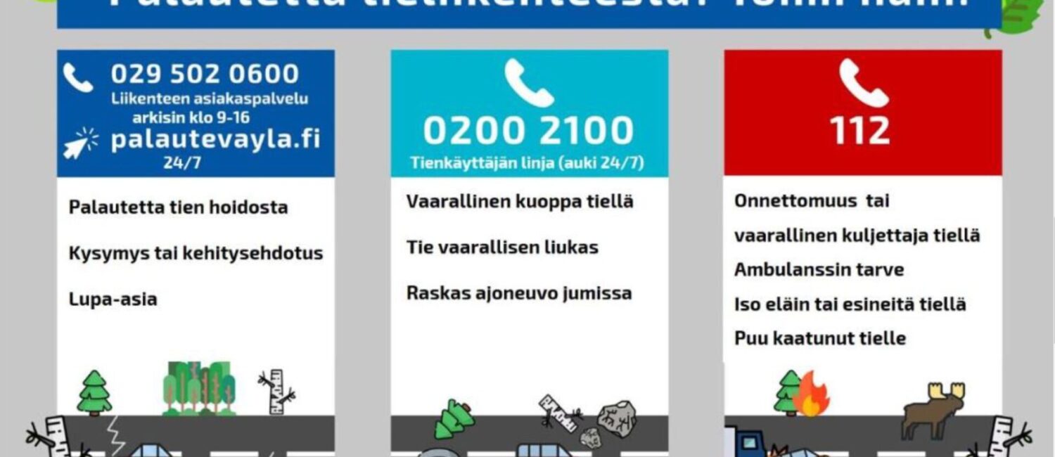 Oletko huomannut tieliikenteessä huomautettavaa? Tässä sinulle ohjeistus mihin puhelinnumeroon tai sähköpostiin ottaa yhteyttä eri asioissa. Palauteväylässä voit tehdä suoraan tarkan ilmoituksen tien kunnosta tai muusta ongelmasta.