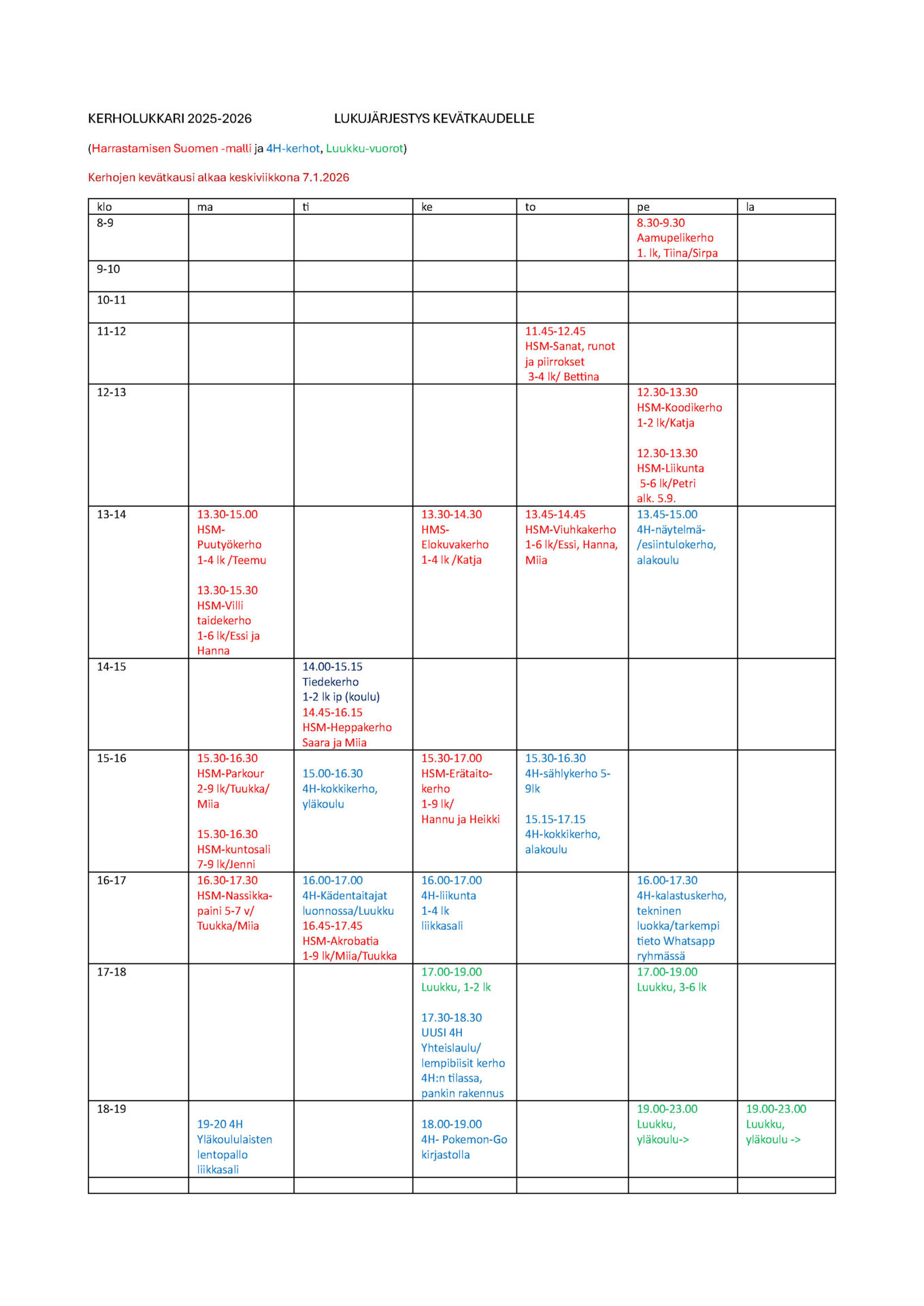 Kerhoja pidetään koululla, liikuntasalissa tai koulun pihapiirissä, ellei muuta ilmoiteta. Lisätiedotteita jaetaan tarpeen mukaan myöhemmin, ja kerhonvetäjät myös ilmoittavat kerholaisilleen muutoksista.