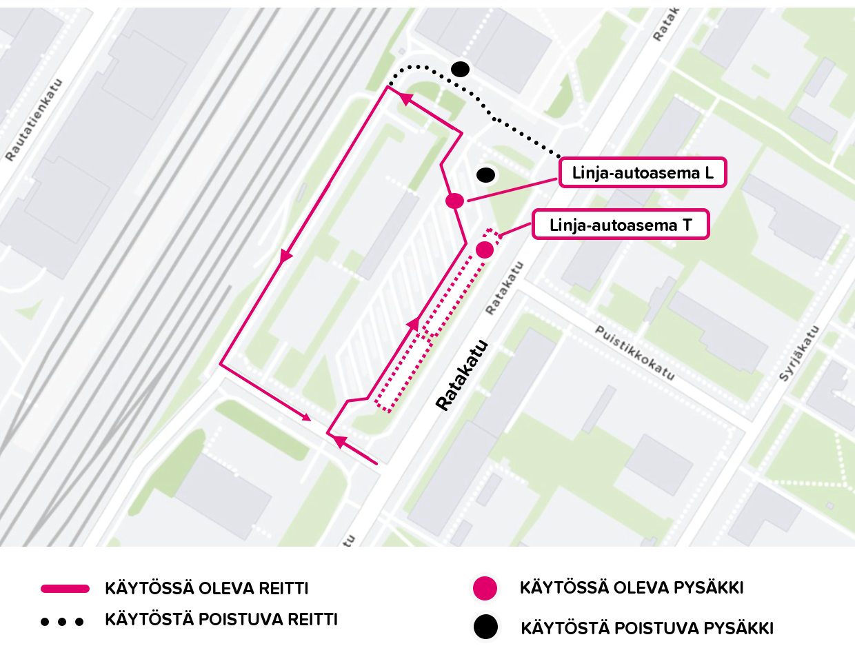 Pysäkki Linja-autoasema T siirretään Ratakadun puolelle laiturien alkupäähän.
