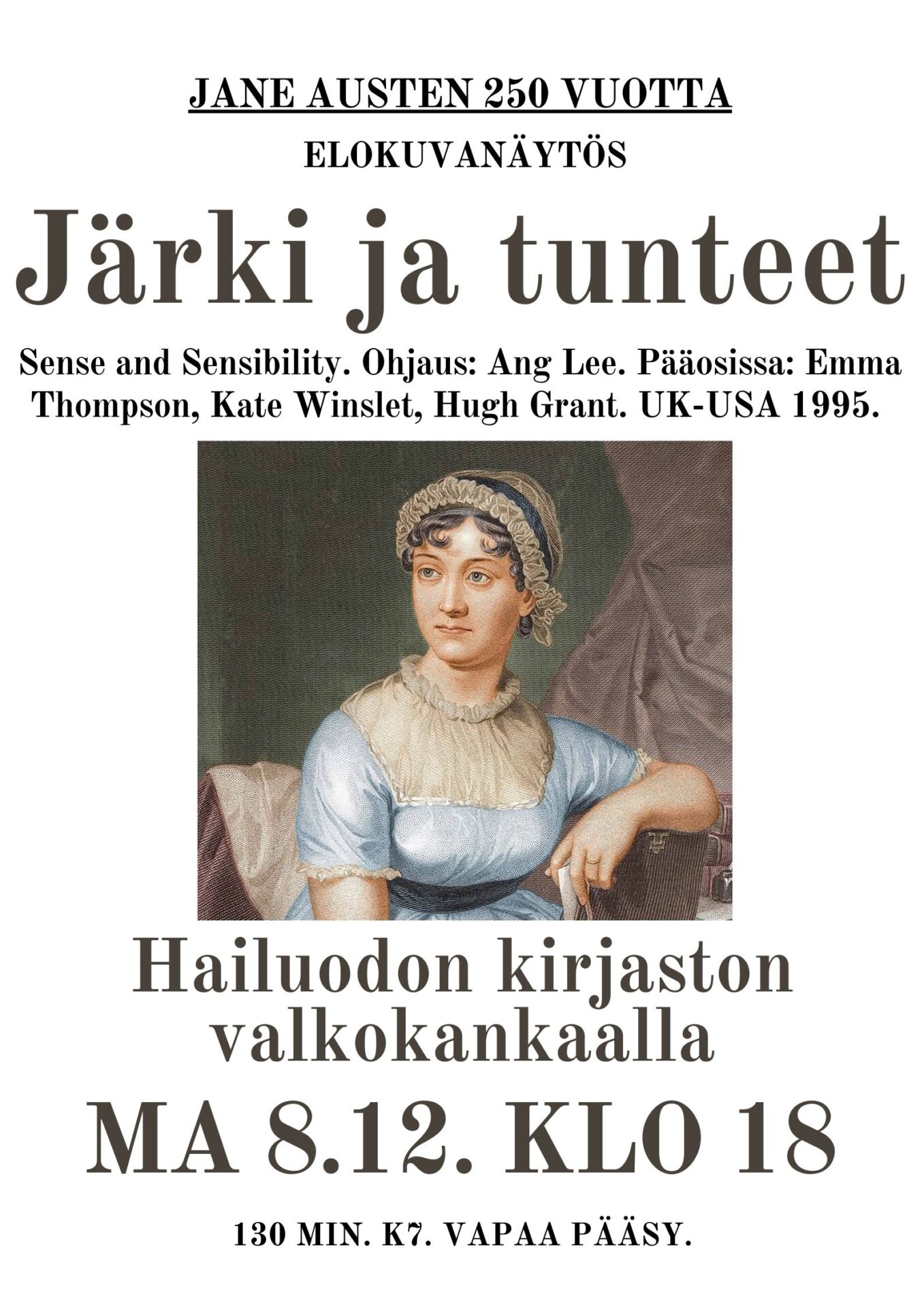 Brittikirjailija Jane Austenin 250-vuotisjuhlan kunniaksi Hailuodon kirjasto esittää kenties parhaan Austen-filmatisoinnin, Ang Leen ohjaaman elokuvan Järki ja tunteet (1995). Älykäs ja hauska romanttinen draama kuvaa jäykän tapakulttuurin ja rakkauden palon yhteentörmäystä kevyen satiirisesti, mutta tuo esiin myös vakavampia puolia, kuten naisiin kohdistuvan taloudellisen pakon. Kielletty alle 7-vuotiailta. Vapaa pääsy.