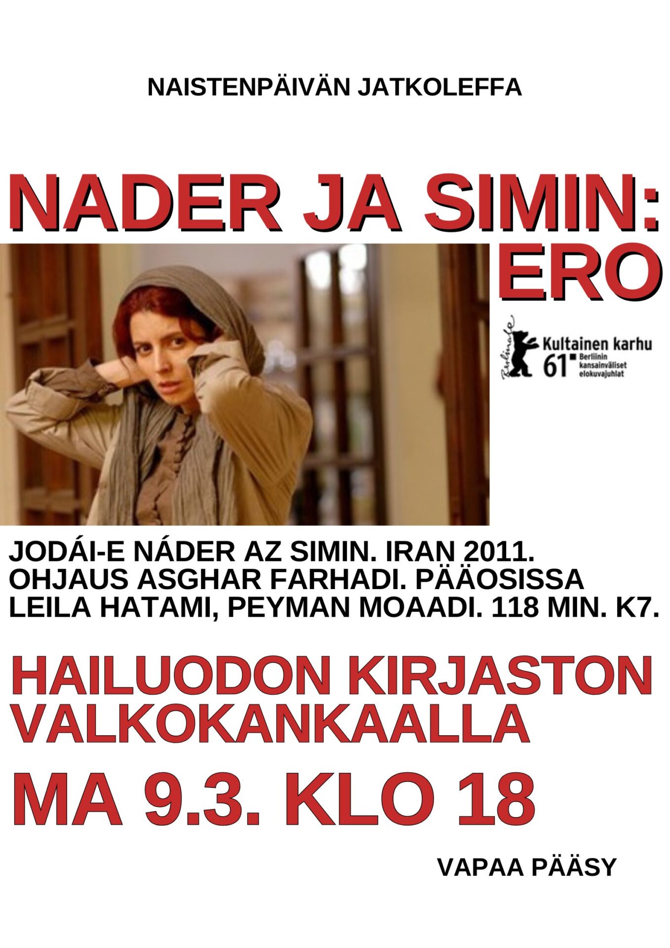 Naistenpäivän jatkoksi Hailuodon kirjasto esittää intensiivisen draamaelokuvan, joka käsittelee avioeroa, perhettä, vanhustenhoitoa ja arkielämän moraalisia kipukohtia. Nader ja Simin: Ero (2011) on iranilaisen ohjaajan Asghar Farhadin kansainvälinen läpimurto, Oscarin sekä Berliinin elokuvajuhlien pääpalkinnon voittanut kertomus avioeroa läpikäyvästä pariskunnasta, jonka keskinäiset ristiriidat laajenevat koskemaan kotihoitajaksi palkattua naista ja tämän perhettä.