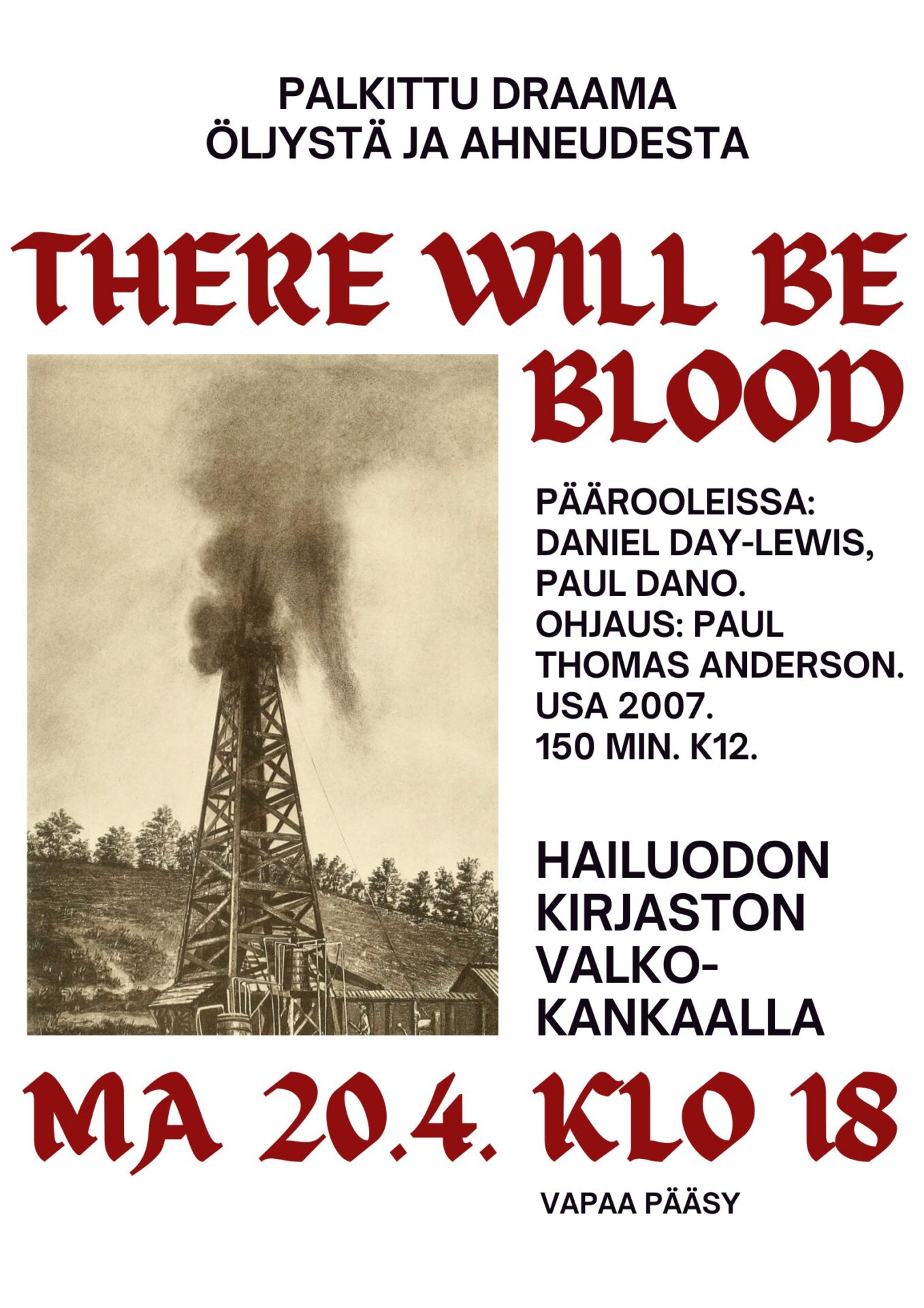 Maailmanpolitiikan pyöriessä taas öljyn ympärillä Hailuodon kirjasto esittää elokuvan öljybisneksen syntyvaiheista. There Will Be Blood (2007) on intensiivinen historiallinen draama pääoman kasaamisesta. Daniel Day-Lewis loistaa Oscar-palkitussa roolissaan pirullisena öljykapitalistina. Kielletty alle 12-vuotiailta. Vapaa pääsy.