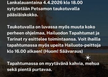 4.4.2026 @ 16:00 – 20:00 – Lankalauantaina 4.4. klo 18 sytytetään Petsamon taukotuvalla pääsiäiskokko. Taukotuvalla on luvassa myös muuta koko perheen ohjelmaa. Hailuodon Tapahtumat ja Tarinat ry toivottaa sinut lämpimästi tervetulleeksi.