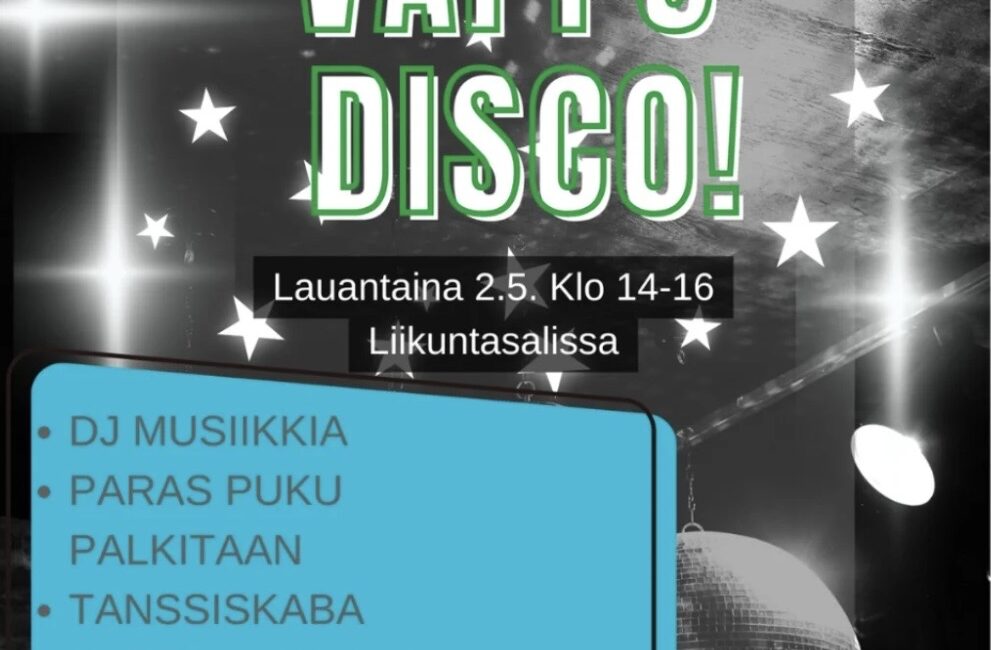 Lapsille ja nuorille vappudisco lauantaina 2.5. klo 14-16 liikuntasalissa.