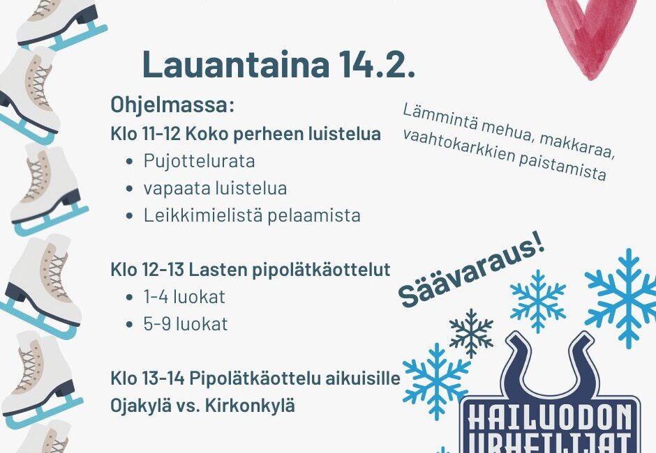 Lauantaina 14.2. Hailuodon Urheilijat järjestää mukavan ystävänpäivän luistelutapahtuman kaukalolla.