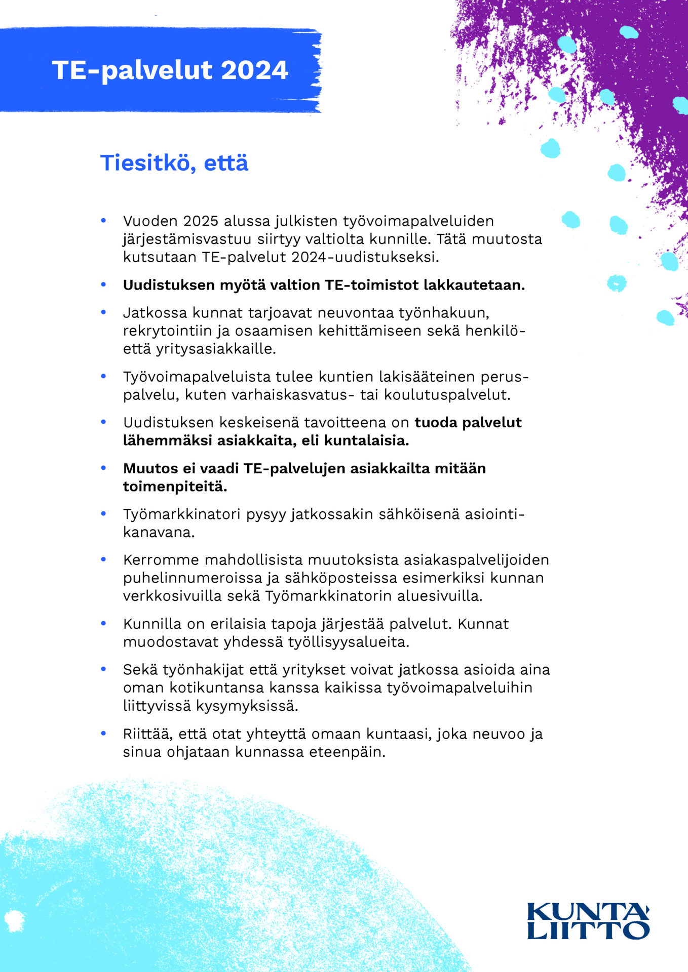 Ensi vuoden alusta lähtien TE-palvelut siirtyvät kuntien tehtäväksi ja valtion työ- ja elinkeinotoimistot eli TE-toimistot lakkautetaan. Työvoimapalveluista tulee osa jokaisen kunnan peruspalveluja, samaan tapaan kuin esimerkiksi sivistys- tai yhdyskuntarakentamiseen liittyvät palvelut.